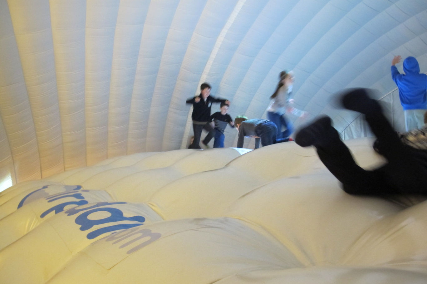 Air.puddle is an collective entertainment experience for kids based on the interface between interactive projections and jumping pillows. The motivation is cognitive and physical, and takes place socially inside a customized air.shell. The air.puddle is a hive of activity, sometimes synchronized and sometimes anarchic, as each child engages images with gestures, and new behaviors emerge and propagate unexpectedly. It is tempting like the sky reflected in a puddle, and the kids jump in with both feet. The first air.puddle was be showcased at Princes Mall in Edinburgh for the christmas festival 2014.