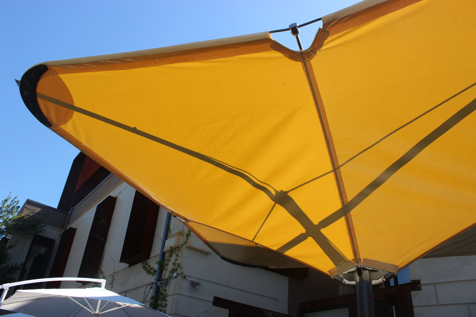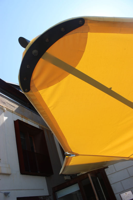 narrative>> the restaurant terrace at the dinamarca co-working, with its unique views over the bay, is a constant hive of networking. however the existing off-the-shelf shade umbrellas were regularly harvested by the fierce south winds [100km/hr], the contract for producing a permanent and wind resistant shade emerged, and squareshade was our way of applying the techniques developed in the loopdown project on a smaller scale. the inverted cone ensures the dirt is out of sight, generating shade that is continuous with its surroundings while framed by luminous chromatic surfaces. the tension cable detailing is informed by yacht rigging. the squareshade design is conceived as working in clusters, with different toned membranes and integrated illumination to generate hi-performing atmospheres for restaurant terraces.