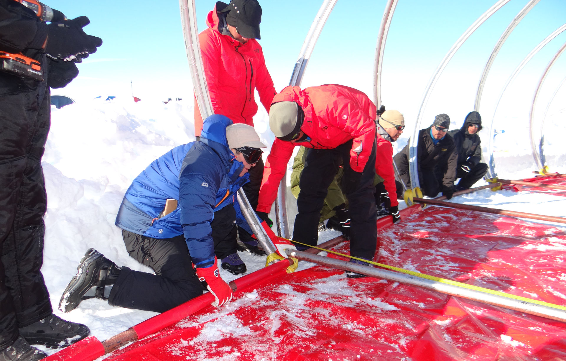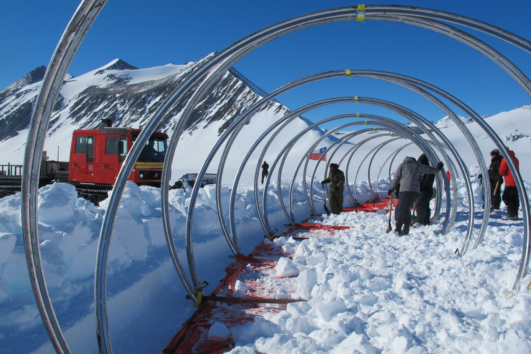 reinsertion > With the collaboration of INACH glaciologists, the station was assigned a new location on Union Glaciar, which moves at 22m per year, in a crevasse-free zone 9km south of the blue ice runway. The tunnel, modules and support systems were deployed in just 14 days in a repetition of the process that had been undertaken in Patriot Hills 14 years before. The membranes of the Tunnel and the Sastruggi were completely replaced, updating the specification of the materials and the confection patterns to generate a surface with greater curvature and therefore better adapted to resist the demanding polar conditions. The sala sastruggi was reconditioned with new membranes including translucent insulation in its double skin to maximize the energetic input from the abundant solar radiation. The six modules were successfully integrated into the tunnel with their mangas, and with the addition and polishing of the polycarbonate visors at each extreme the station was completed..