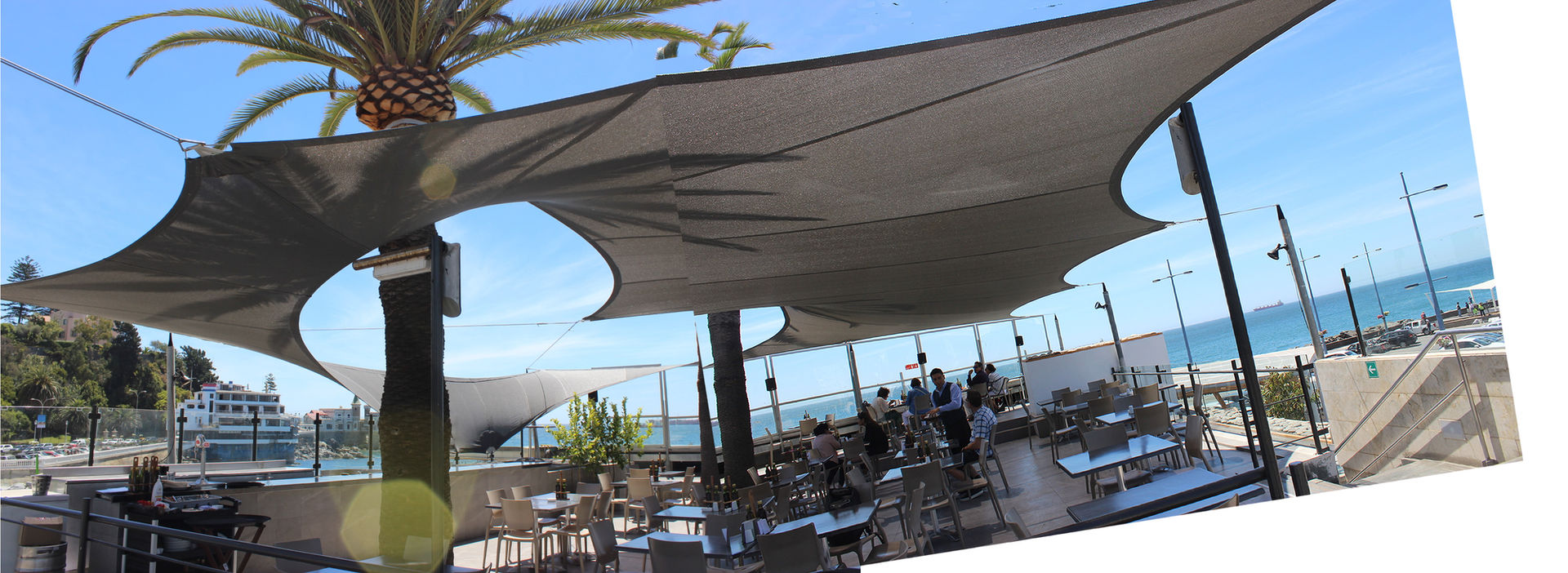 narrative>> the newly renovated nogaro restaurant of the casino in viña del mar required solar protection for its roof terrace, but did not have a sufficient budget for a full tension membrane with its associated structure. we developed a shadesail solution whose low loading allowed the use of existing perimeter pillars, and we improvised two highpoints from the existing palm trees, applying sling nooses that generate a max. load of 2kn which was easily absorbed by the tree. the topology of the surface is a section of a torus, and the central void re-inscribes the essence of being below the sky on the roof terrace, while providing ample perimeter shading for tables. the extravagant loop at the centre playfully engages with loading points from the palm trees to the bar, establishing a series of continuous relationships between them all. the loop is deployed around the base of the trees and then a novel detail with a steel rod stitches the surface together. the surface was fully developed in form finder software and confectioned from 12 unique panels, producing a three dimensional form that stretches perfectly to shape and is extremely stable in high winds.